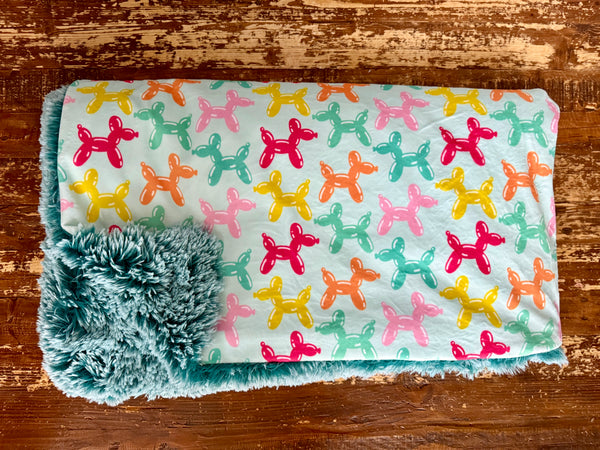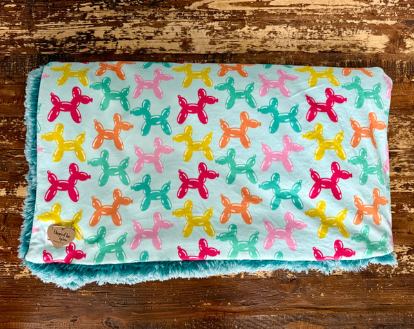 The front features a playful print of colorful balloon dogs in shades of pink, teal, orange, and yellow — a cheerful pattern that instantly brightens any room or nursery. The design sits on a soft, smooth minky fabric that’s gentle on the skin and perfect for all ages.