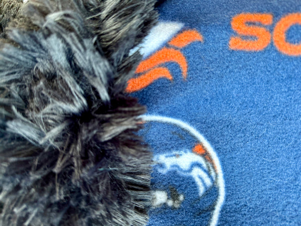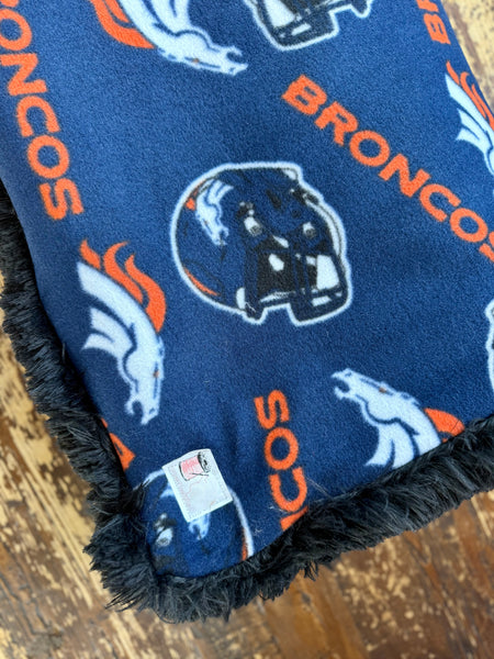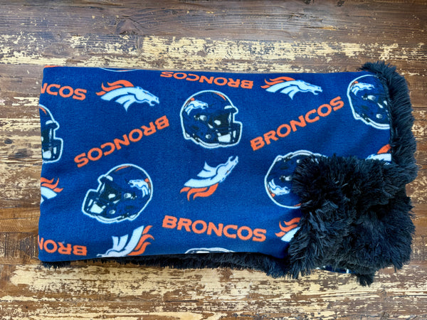 This adult fleece blanket is the ultimate must-have for any Denver Broncos fan. The front features a bold navy background covered in Broncos logos, helmets, and iconic stars—perfect for showing off your team pride on game day or every day. The soft fleece front provides lightweight warmth, while the reverse side is lined with ultra-plush, shaggy black faux fur for extra coziness and comfort.