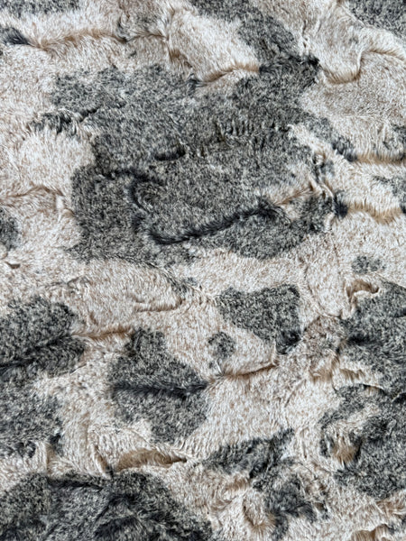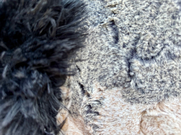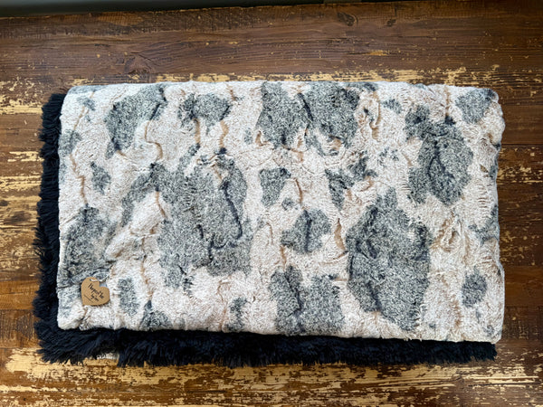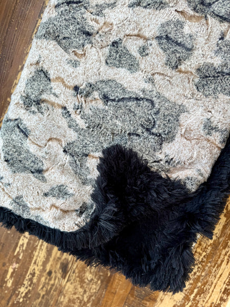 This adult-sized minky blanket brings together modern style and luxurious softness. The front showcases a textured, animal-print-inspired pattern in shades of brown and black, giving it a bold yet elegant look. The reverse side is backed with ultra-plush shaggy black faux fur minky, creating a perfect balance of warmth, comfort, and sophistication.