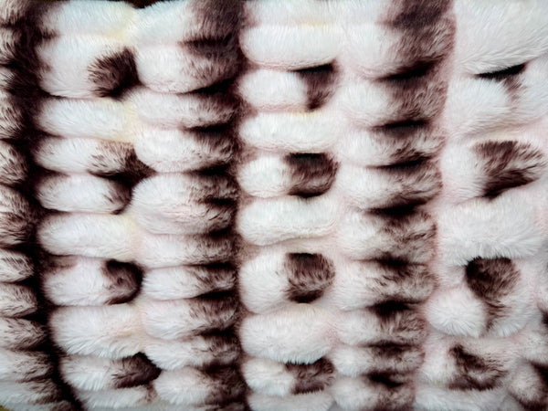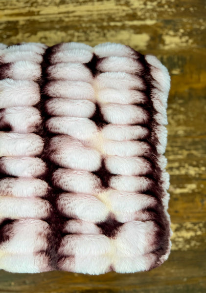 This Enzo blanket features a beautifully soft blush pink base accented with rich plum-burgundy shading throughout its sculpted faux-fur texture. The combination creates a romantic, elegant look that stands out while still feeling warm and inviting. The plush, velvety fibers offer incredible softness and a cozy, weighted drape that makes it perfect for snuggling, lounging, or styling as a statement throw.