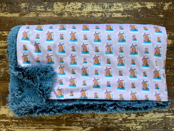 This adult-sized minky blanket is perfect for fans who want to wrap themselves in comfort and style. The front features a pastel pink background patterned with Lover-inspired portraits and text, giving it a playful, nostalgic vibe. The reverse side is backed with luxuriously soft, shaggy faux fur minky in a blue with white tip, offering warmth, coziness, and a touch of bold contrast.