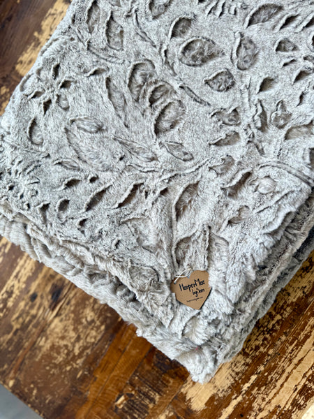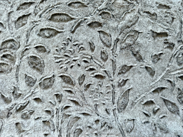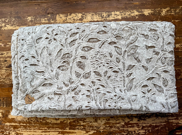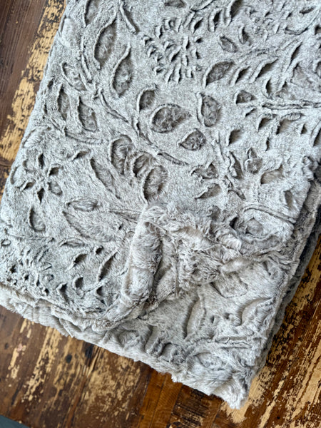 This adult-sized minky blanket combines timeless beauty with luxurious softness. The fabric features a raised floral and leafy embossed pattern in a soothing taupe tone, adding depth, texture, and a touch of sophistication to your space. The velvety minky material is buttery soft against the skin, perfect for cozy evenings, relaxing on the couch, or adding a refined accent to your bedroom décor.