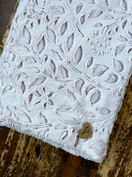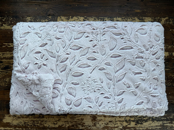 This adult-sized minky blanket combines timeless beauty with luxurious softness. The fabric features a raised floral and leafy embossed pattern in a soothing rosewater tone, adding depth, texture, and a touch of sophistication to your space. The velvety minky material is buttery soft against the skin, perfect for cozy evenings, relaxing on the couch, or adding a refined accent to your bedroom décor.