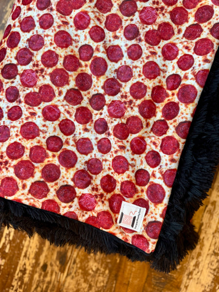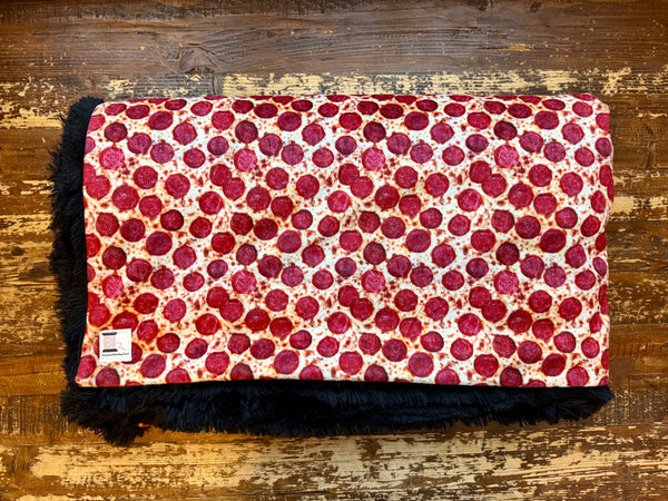 This adult-sized minky blanket is as bold and fun as it is cozy! The front features a realistic pepperoni pizza print—ooey, gooey, and fresh from the oven in design—while the back is lined with ultra-soft, shaggy black faux fur minky for warmth and comfort.