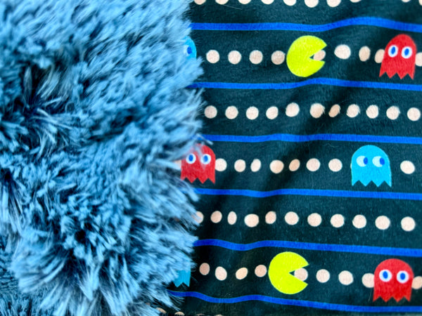Level up your cozy game with this playful, nostalgia-packed blanket! The front features a fun, retro arcade-inspired design with colorful characters and dotted paths reminiscent of classic video games, while the back is lined with ultra-soft, shaggy blue minky that’s as cozy as it gets.