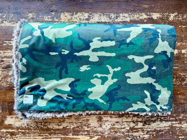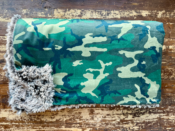 This adult blanket brings together rugged style and unbeatable comfort. The top layer features a classic green camouflage print, perfect for anyone who loves the outdoors, military-inspired design, or bold statement patterns. On the reverse side, it’s lined with ultra-soft, plush brown with white tip faux fur minky that delivers cozy warmth and a luxurious feel. Generously sized for adults, it’s great for lounging on the couch, layering on the bed, or taking along on camping trips. With its mix of durability, style, and softness, this blanket makes an excellent gift for outdoor enthusiasts or anyone who enjoys snuggling up in comfort.
