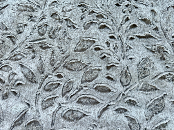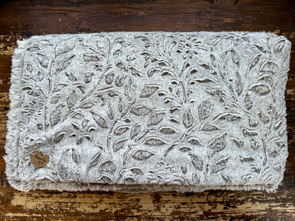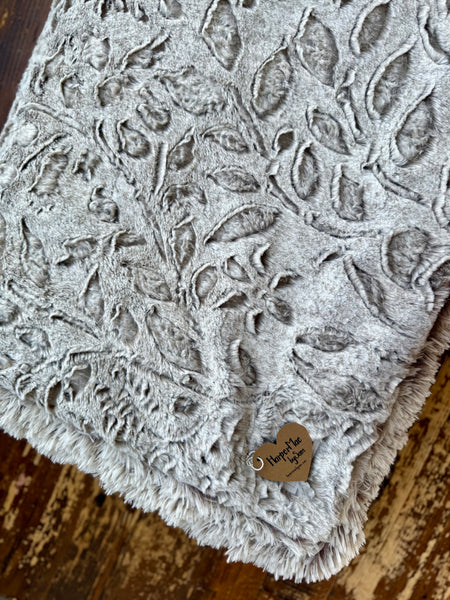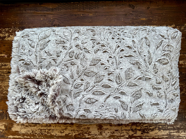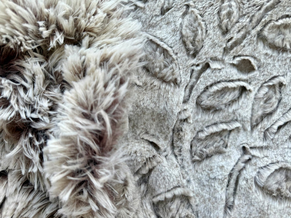 This adult-sized minky blanket is the perfect blend of beauty and coziness. The front features a raised floral and leafy embossed design in a soft, soothing taupe tone, giving it a timeless and sophisticated look. The reverse side is backed with luxuriously plush faux fur minky in a shaggy tan with white tip fur, offering warmth, softness, and a touch of elegance.