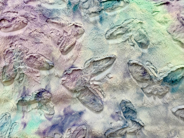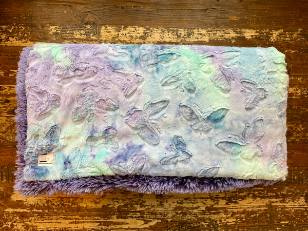 Wrap yourself in comfort with this enchanting adult-sized minky blanket. The front features a dreamy pastel watercolor design in soft hues of lavender, mint, and sky blue, embossed with delicate butterfly patterns that add texture and elegance. The backing is a luxurious deep lavender with white tip shag minky, offering the ultimate in coziness and warmth.