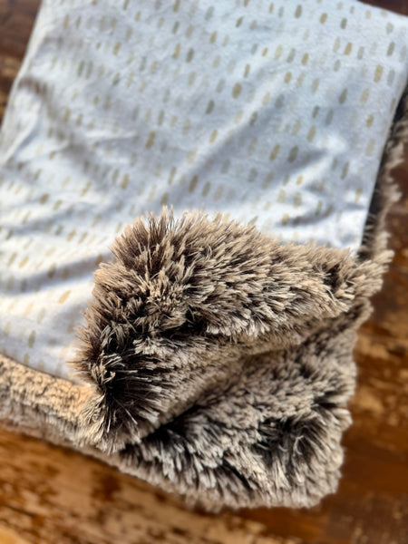 Wrap your little one in pure comfort with this ultra-soft baby blanket. One side features a smooth, white minky fabric accented with subtle golden-beige dotted patterns for a modern, neutral look. The other side is lined with plush, shaggy faux fur in brown with white tips—perfect for snuggles, naps, and keeping your baby cozy year-round.