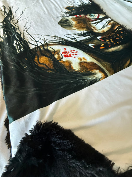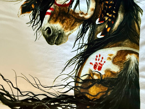 This baby blanket features a striking watercolor-style horse design that feels bold, artistic, and meaningful. The horse is richly detailed with flowing black mane, warm brown and cream tones, tribal-inspired face paint, and a distinctive red handprint on its shoulder. The artwork has strong movement and texture, giving the blanket a unique, high-end look.