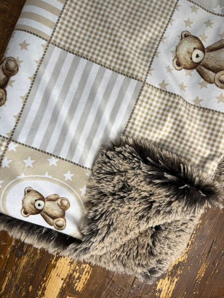 This mini baby blanket features a sweet neutral patchwork design with teddy bears, stars, gingham, and soft stripes—perfect for any nursery theme. The front is smooth and gentle on baby’s skin, showcasing warm beige and cream tones that create a calm, cozy look.