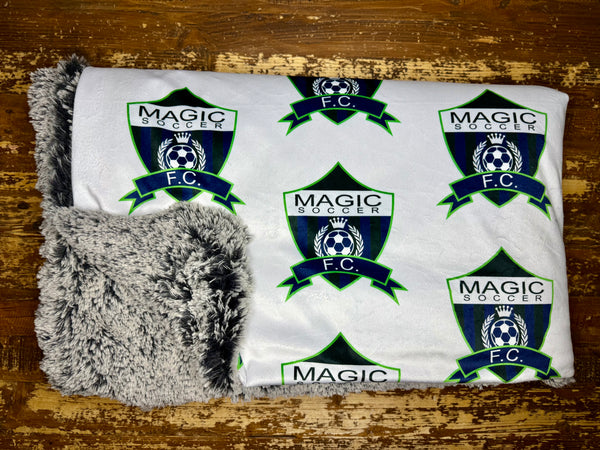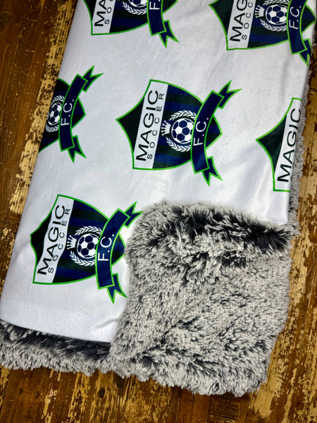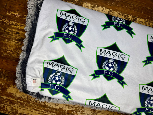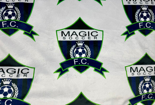 This blanket features a clean, sporty soccer design with repeating Magic Soccer FC crests in navy, green, and black on a crisp white background. The bold logo print gives it a polished, team-spirit look that’s perfect for players, fans, and families alike.
