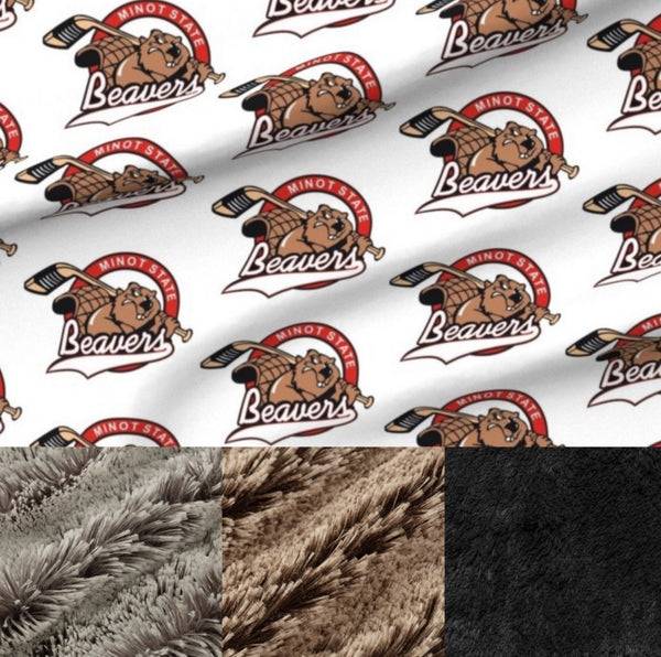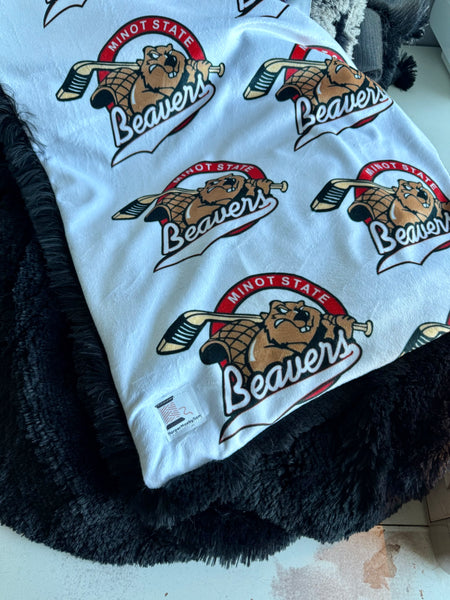 Snuggle up and relax with this cozy flannel fur blanket. This blanket is made with a minky Minot State Hockey fabric and a minky shaggy fur that does not shed.