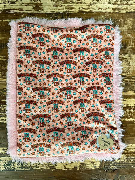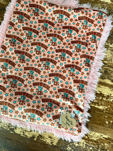 Perfect warm cozy lovey blanket to travel with your baby in their carseat. This blanket is made with a taylor swift minky fabric and a minky shaggy coral fur that does not shed.