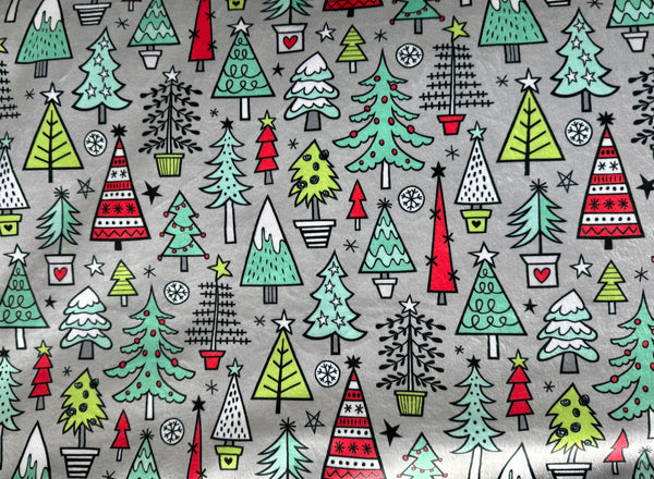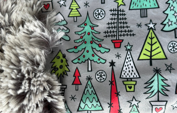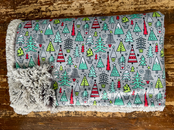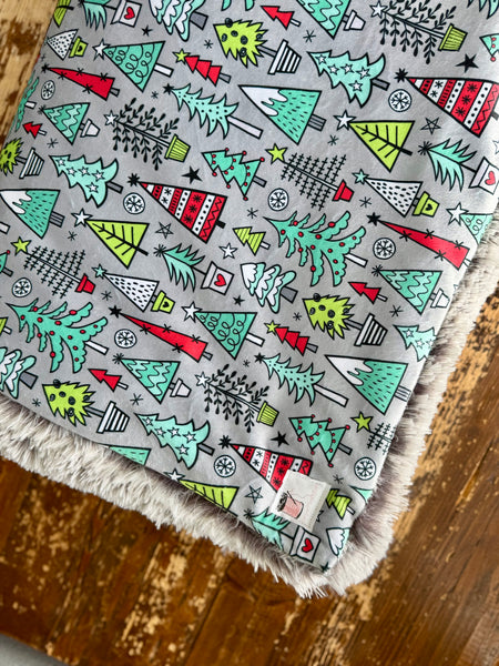 Bring holiday cheer to your home with this playful Christmas-themed minky blanket! The front features a lively mix of modern, hand-drawn Christmas trees in bright reds, greens, aquas, and whites—all set against a soft gray background for a fun, festive look that stands out without being over the top.