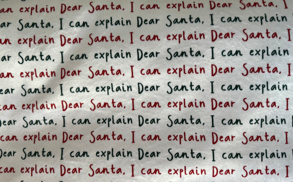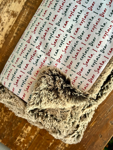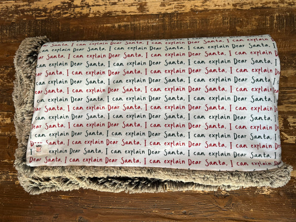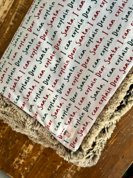 Add a playful touch to your holiday season with this cozy Christmas blanket! The front features a repeating handwritten-style pattern that reads “Dear Santa, I can explain” in festive red and green lettering—perfect for anyone with a sense of humor during the holidays.