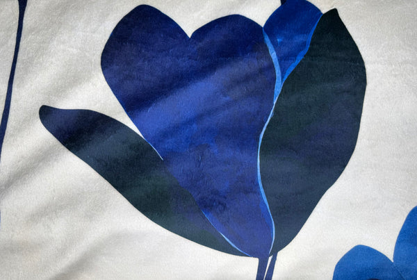 This blanket features a clean, modern floral design with oversized navy and deep blue blooms set against a soft, creamy white background. The look is calm, elegant, and timeless—easy to style with both modern and classic décor.