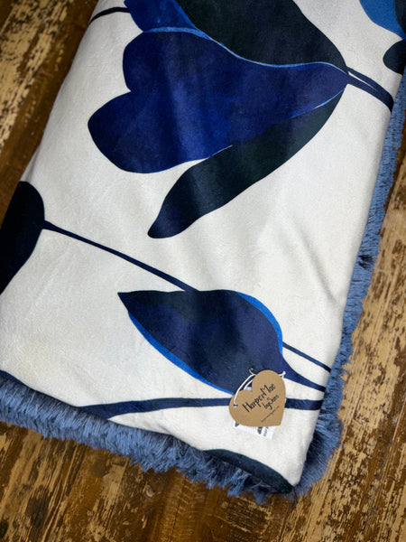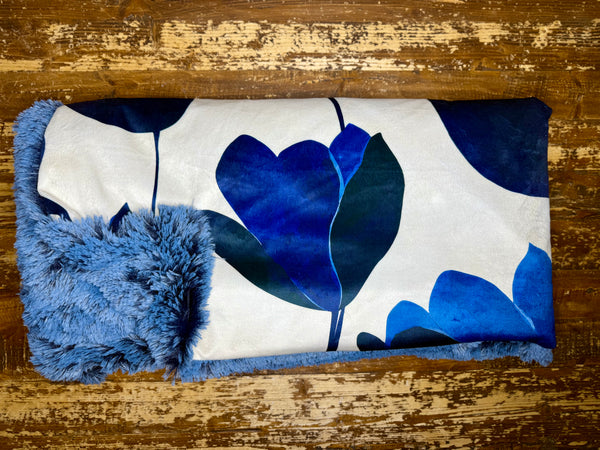 The front is smooth and silky to the touch, while the back is finished with a luxuriously plush blue faux-fur minky that adds warmth and texture without feeling heavy. The rich blue backing perfectly complements the floral print, giving the blanket a polished, high-end feel.