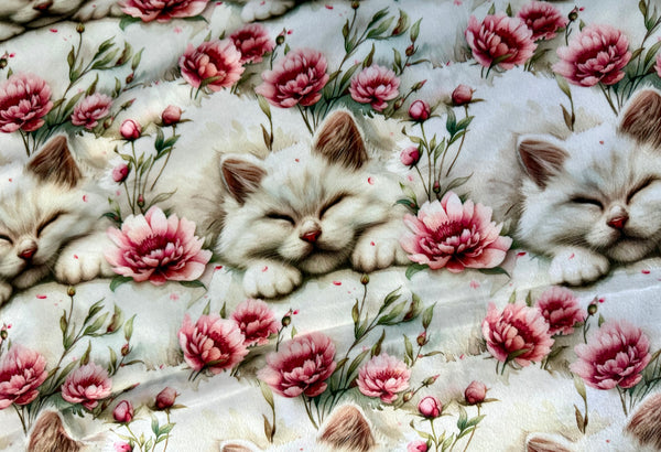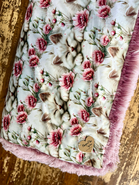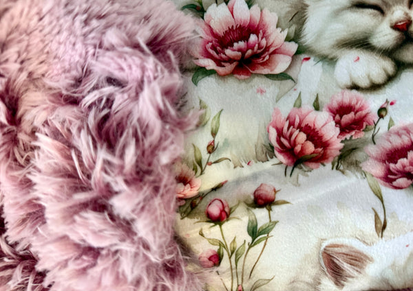 This adorable blanket features a charming print of fluffy kittens nestled among soft pink florals—perfect for anyone who loves cozy vibes with a touch of whimsy. The top side is silky-smooth with beautifully detailed artwork, while the backside is lined with ultra-plush blush faux fur that feels warm, fluffy, and incredibly soothing.