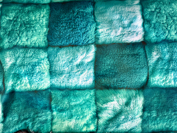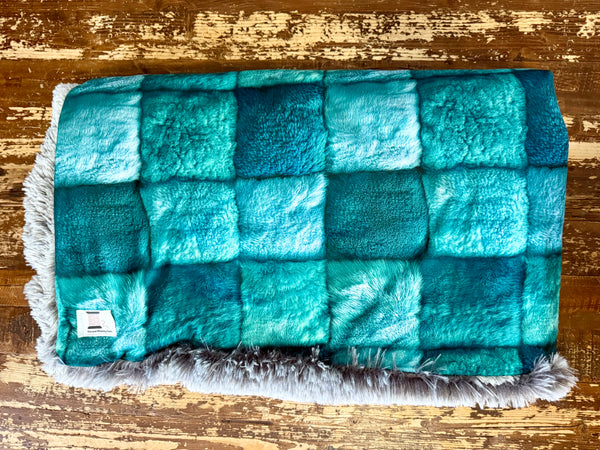 The top features a velvety patchwork design in stunning shades of teal, aqua, and deep ocean blue—each square soft, plush, and rich with texture. Paired with a luxurious faux fur backing in a warm gray blend, this blanket wraps you in the perfect balance of cool tones and cozy comfort.