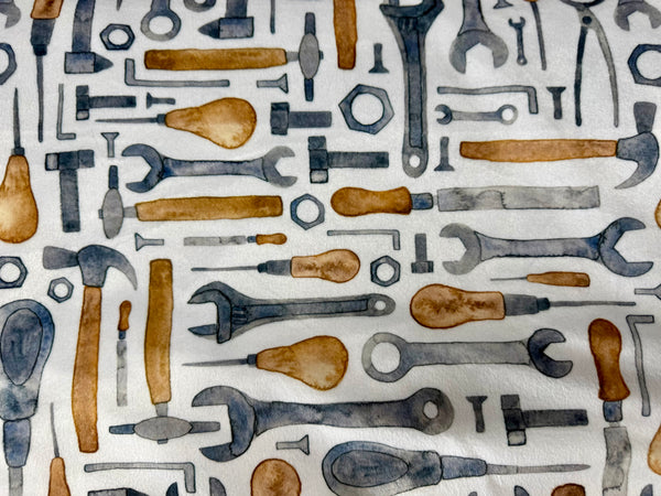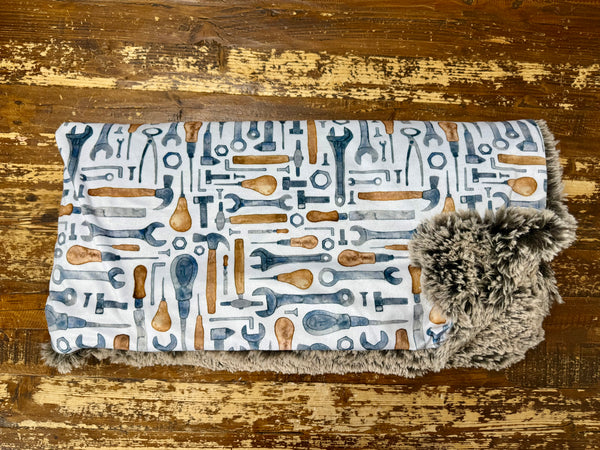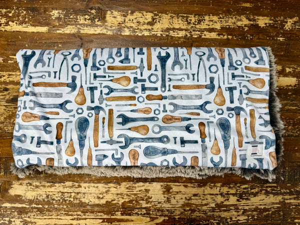 This minky blanket features a playful tool-themed print with wrenches, hammers, screwdrivers, and hardware in classic steel blue and warm brown tones on a soft neutral background. It’s the perfect mix of rugged and adorable.