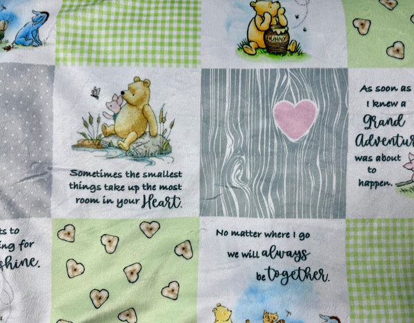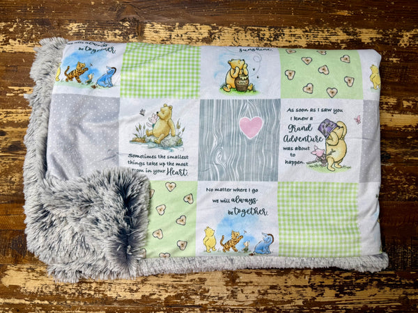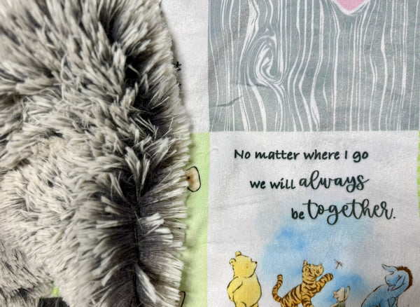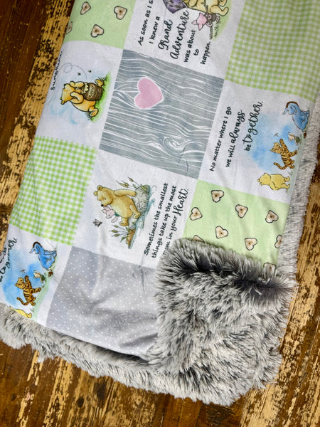 Made with ultra-soft minky fabric featuring an adorable patchwork-style print with classic Winnie-the-Pooh scenes, soft greens, yellows, and greys, plus heart details and meaningful quotesâthis one feels like a warm hug. Itâs paired with plush shaggy silver fur with white-tipped fibers, giving it that fluffy, high-end texture thatâs perfect for snuggling.