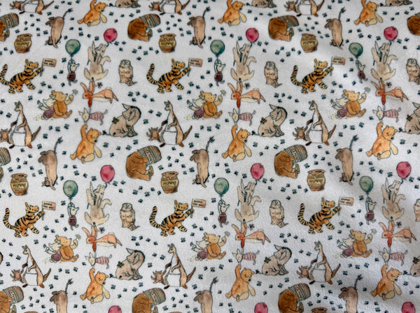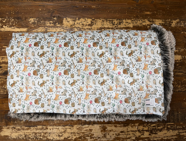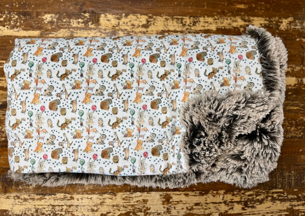 This minky blanket is a perfect blend of playful charm and cozy luxury. One side features a soft minky print filled with adorable storybook-style animals—tigers, bears, bunnies, ducks, and more—scattered across a light, neutral background. The whimsical design feels classic and gentle, making it a favorite for nurseries, playrooms, or cozy family spaces.