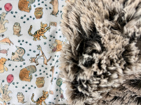 The reverse side is finished with ultra-plush brown fur with white-tipped accents, adding rich texture and incredible softness. The fur gives the blanket a warm, snuggly feel that’s perfect for curling up during nap time, bedtime, or quiet cuddle moments.