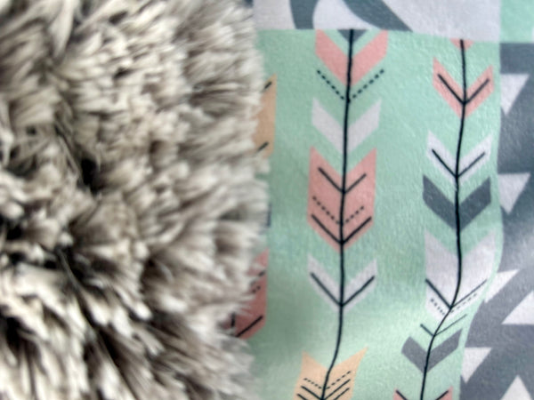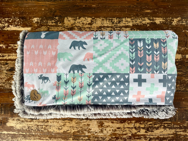 Wrap your little one in cozy, woodland comfort with this stunning handcrafted blanket. The top features a soft, velvety printed minky in a modern patchwork design—complete with bears, arrows, tribal-inspired geometrics, and gentle blush and mint tones. It’s the perfect mix of trendy and timeless.