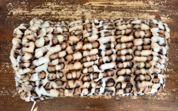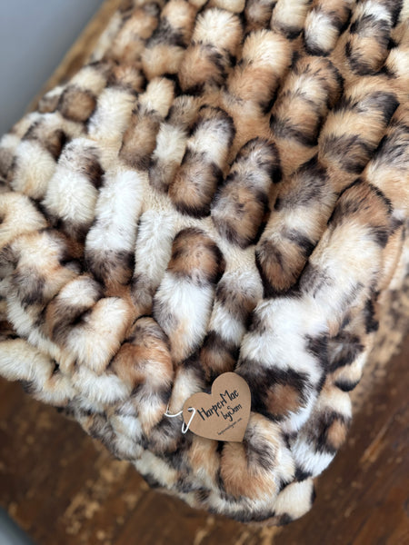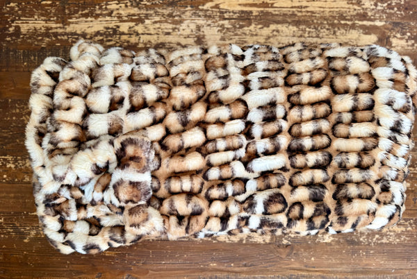 This Enzo blanket delivers a stunning, high-end faux-fur look with a bold mix of cream, caramel, tan, and espresso tones. The sculpted texture creates a plush, dimensional feel, while the spotted pattern adds a luxe, modern twist reminiscent of a soft, refined animal print.