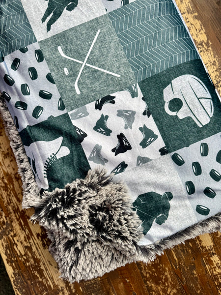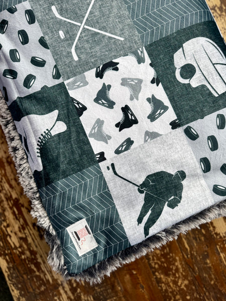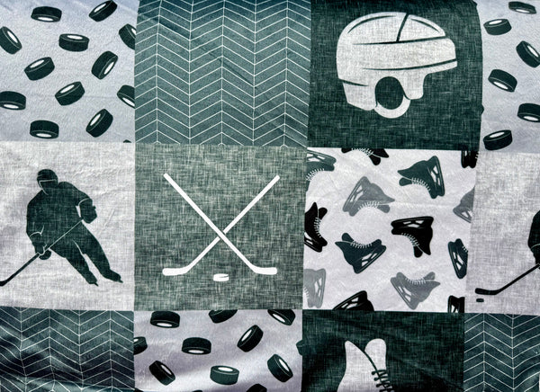 Celebrate your love of hockey with this eye-catching adult minky blanket. Designed in a modern patchwork pattern, it features a mix of classic hockey icons—pucks, skates, helmets, sticks, and players in action—set against a cool palette of grays and deep greens. Each square brings a piece of the game to life, creating a bold and stylish look that hockey fans will love.